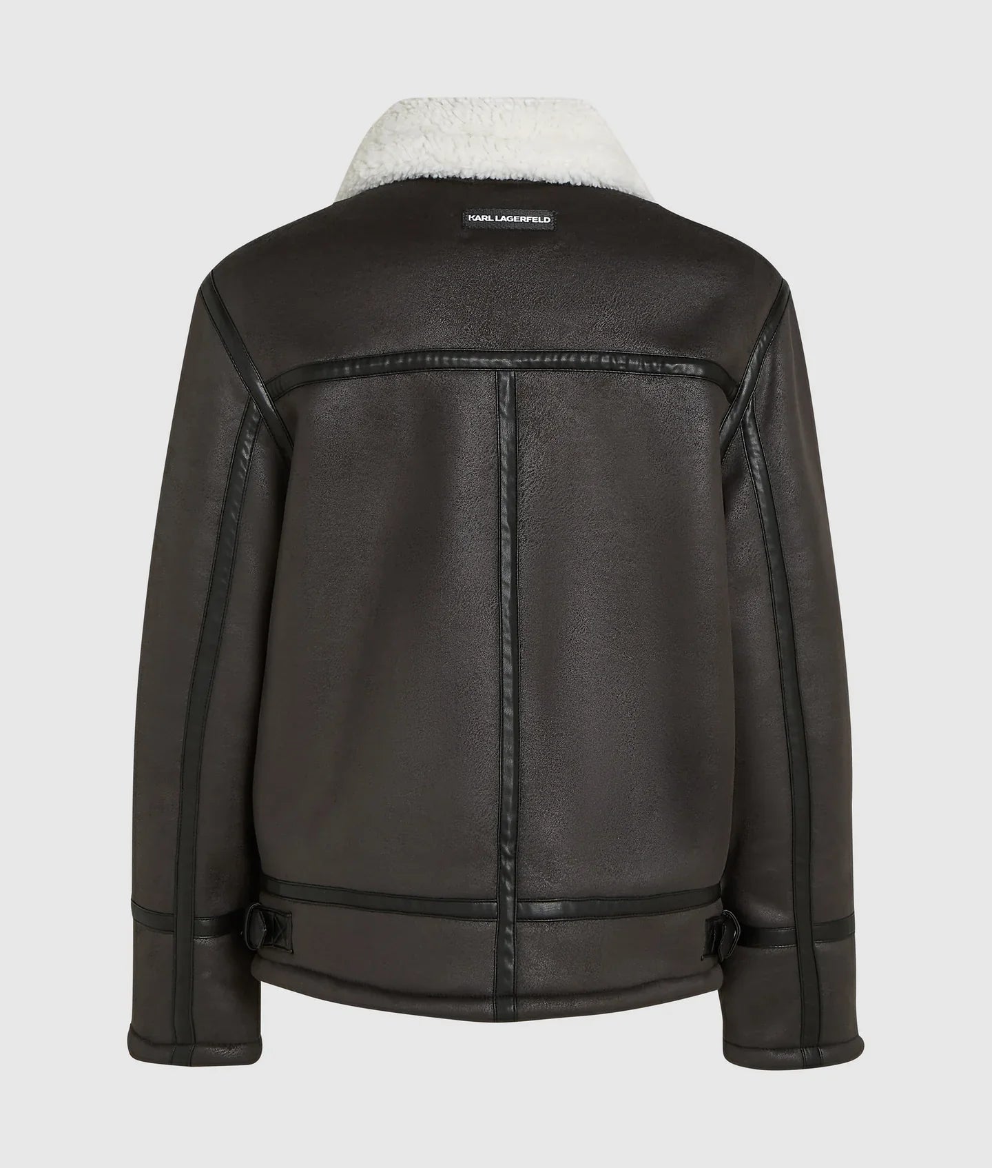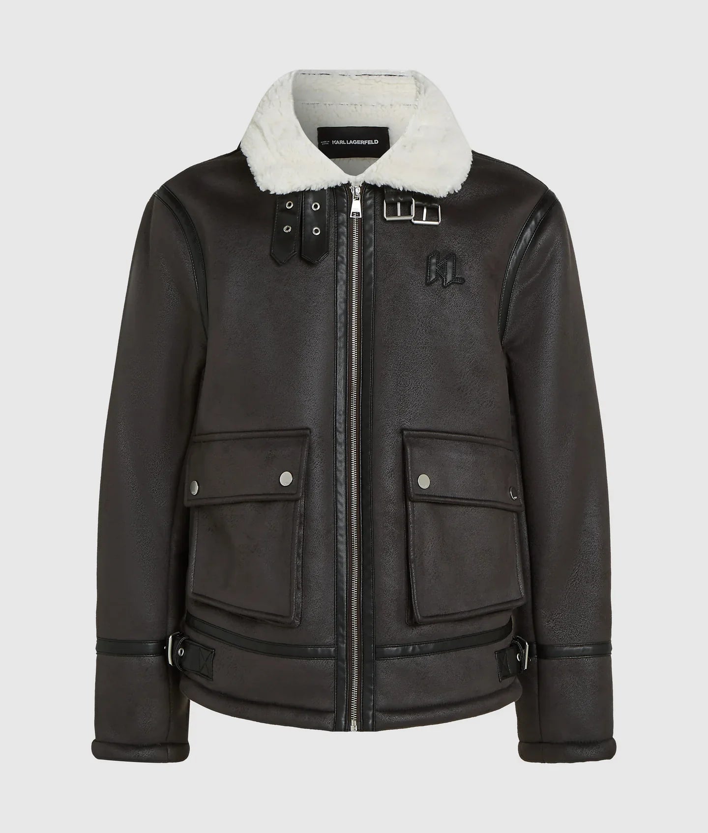 This timeless faux suede jacket combines urban edge with cozy warmth, featuring a faux shearling lining and aviator collar. The KL Monogram adds a signature touch of style.
