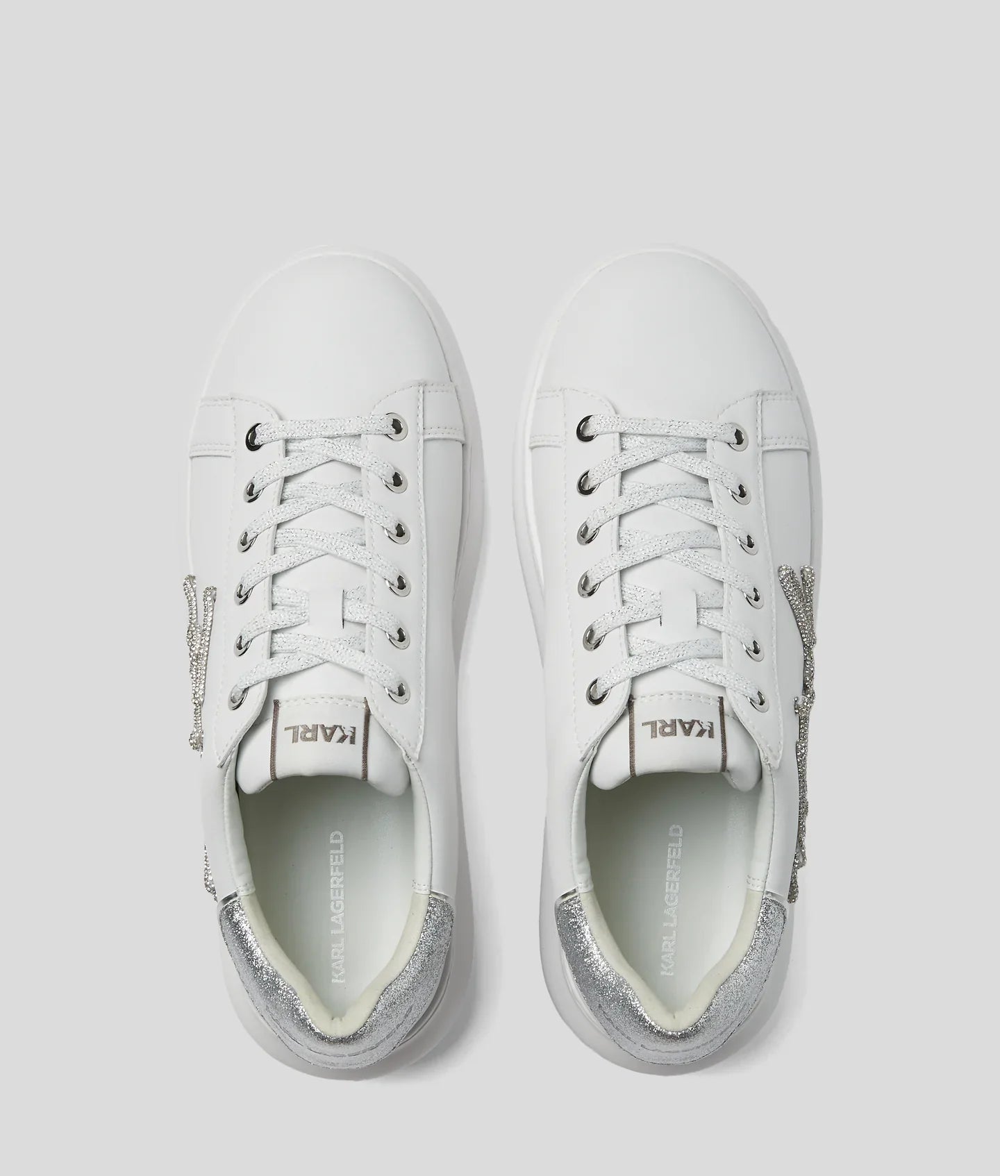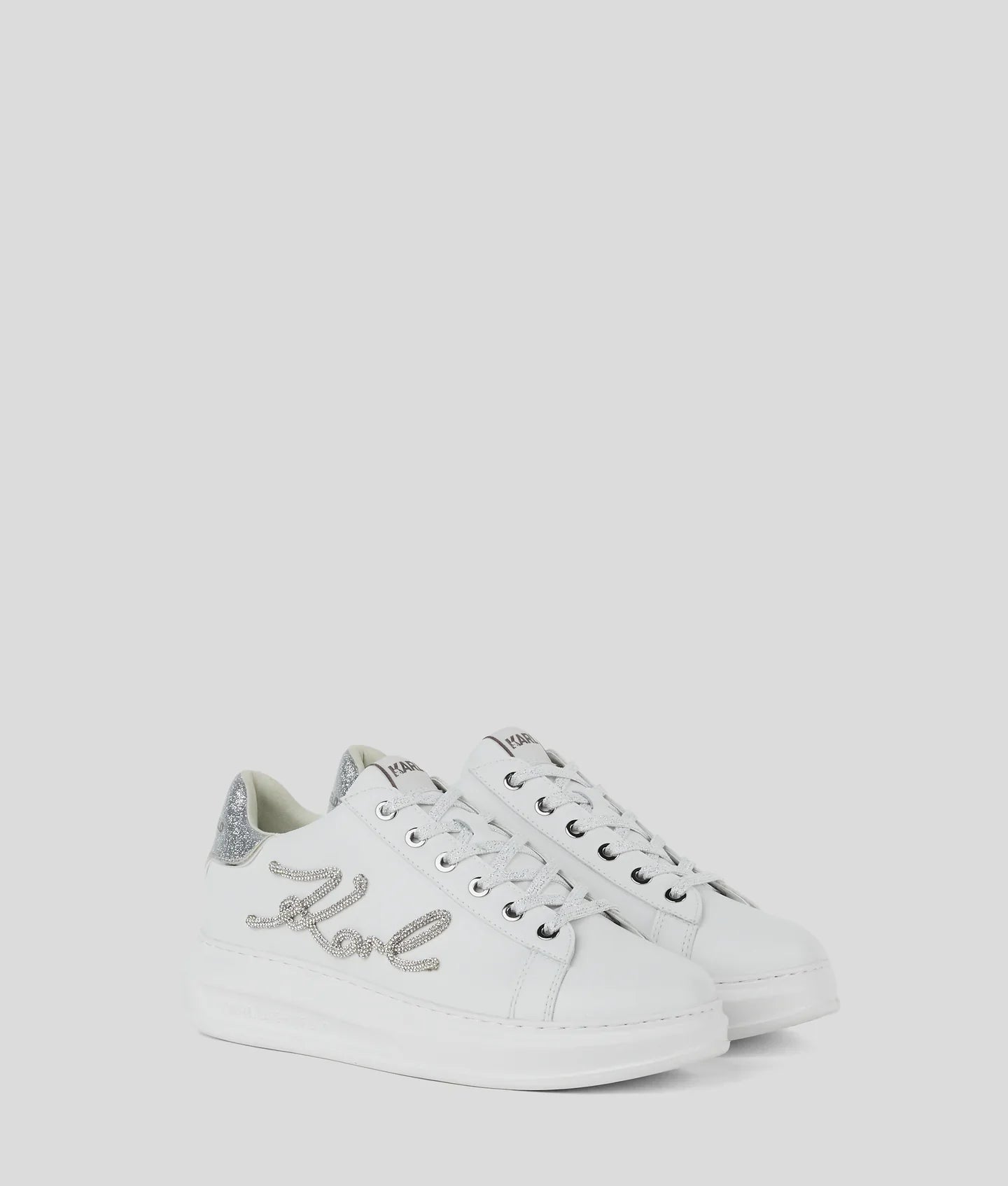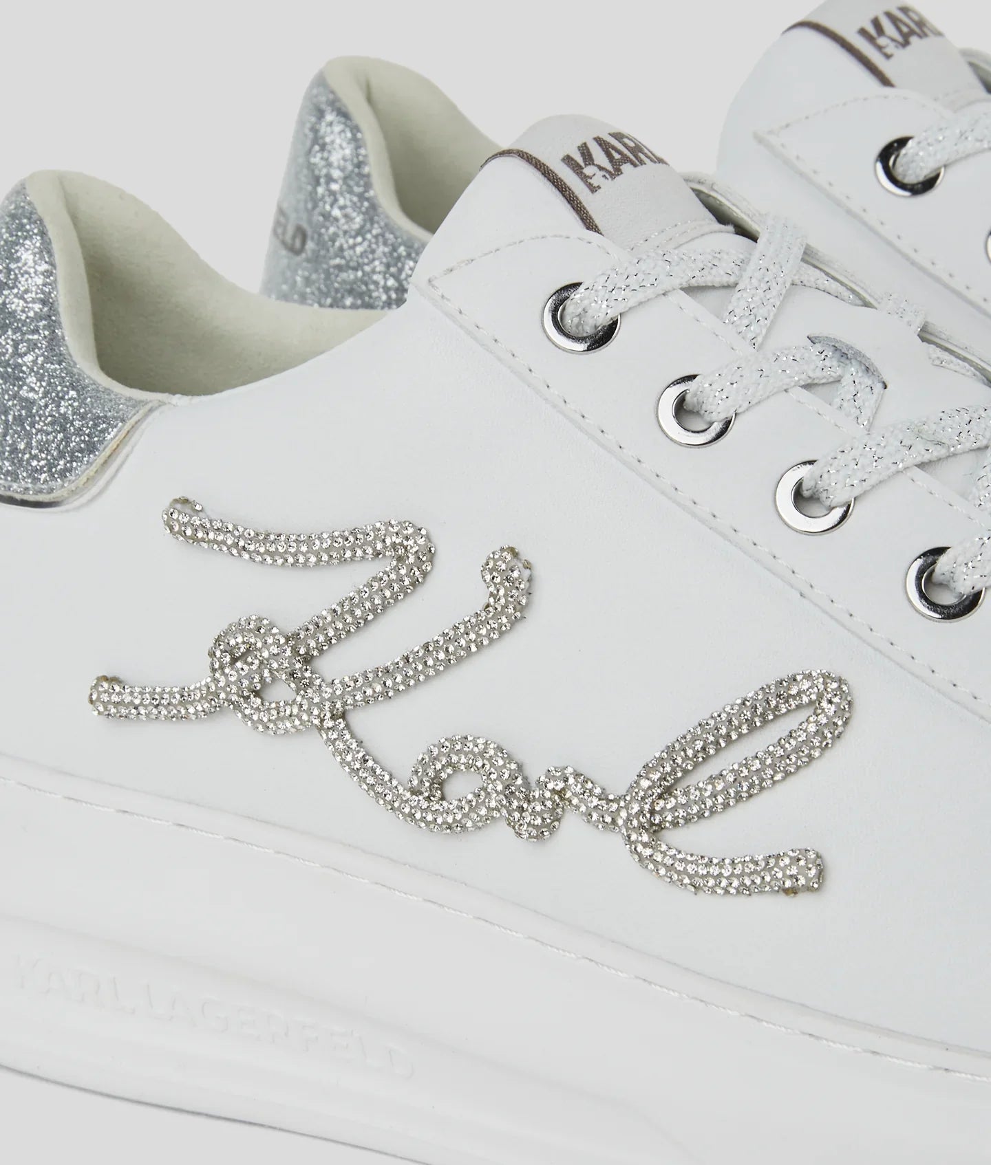 A playful twist on classic style, these sneakers feature glittering laces and a shimmering heel counter adorned with the KARL LAGERFELD logo. The crystal-embellished KARL Signature artwork further enhances their appeal, while the soft textile lining ensures all-day comfort.