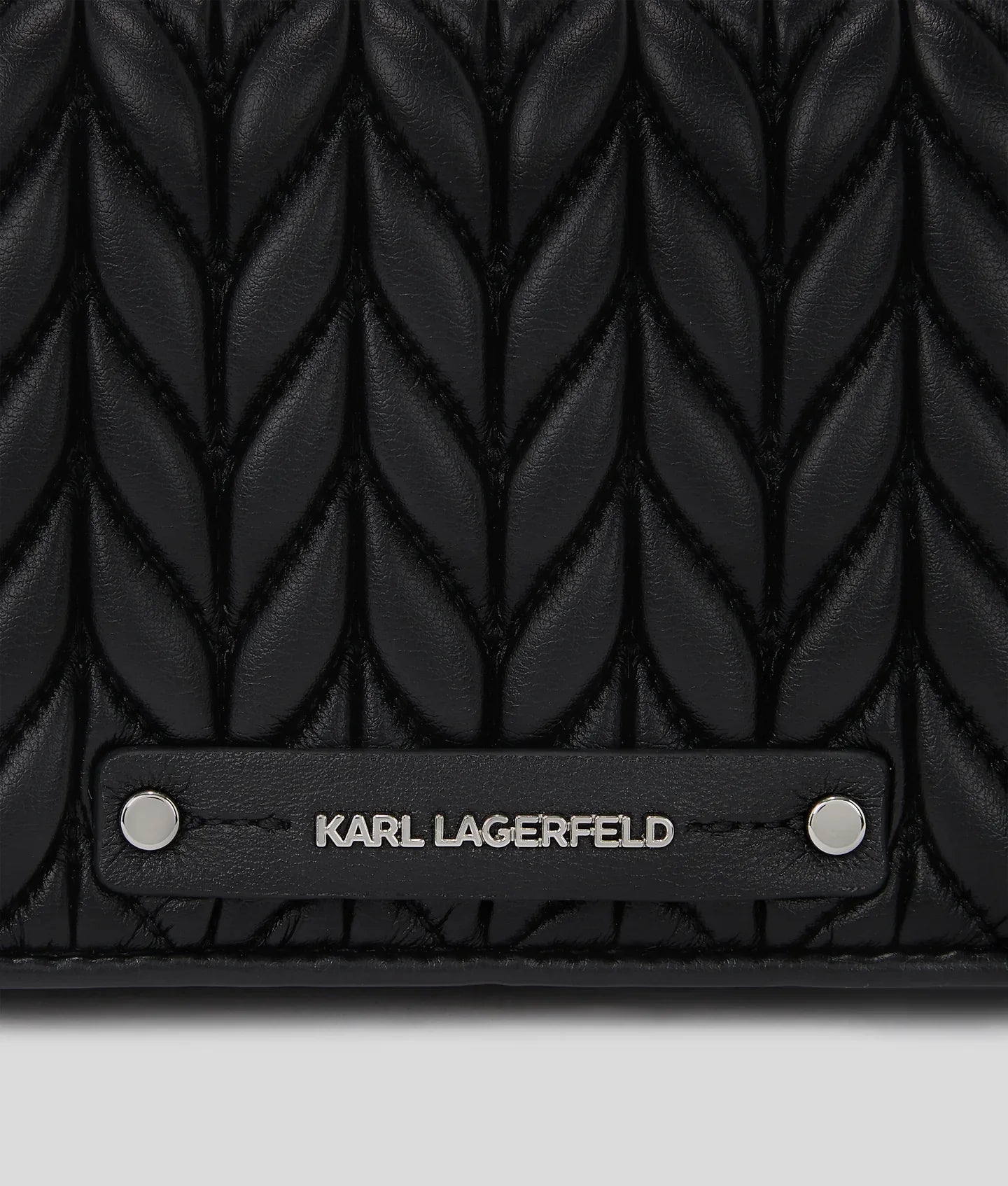 Sleek and stylish, this crossbody wallet, inspired by Karl Lagerfeld's travel pillow, showcases a slim silhouette crafted from innovative technical leather. A chic silver-toned chain strap ensures effortless wear, while a discreet KARL LAGERFELD logo tab adds a touch of flair.